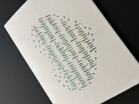 Eine vielseitige Auswahl von Hand beschriebenen und gestalteten Karten habe ich für verschiedene Anlässe im Shop in meinem Atelier. Die bestehende Kartenauswahl besteht aus bunten, verspielten oder auch schlichten Motiven. Gerne fertige ich Karten nach Wunsch an. Die Preise bewegen sich zwischen 8 und 15 Franken. Grössere Karten oder Kunstkarten kosten zwischen 18 - 20 Franken.