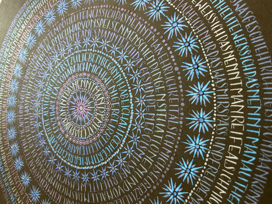 Aufträge für Bilder führe ich sehr gerne aus. Diese Kreisbilder und Kallimandalas (Kombination von einem Mandala welches mit der Kalligraphie verknüpft wird) fertige ich gerne auf Wunsch an. Farben, Text und Grösse sind variabel und kann Ihren Wünschen entsprechend gefertigt werden. Die Preise hängen von der Grösse des Bildes ab.